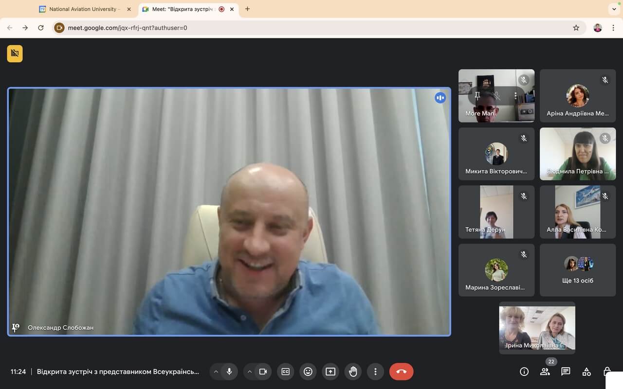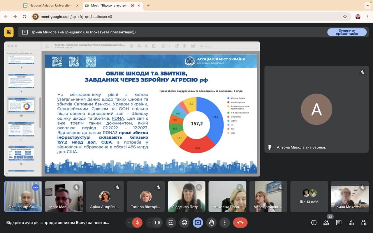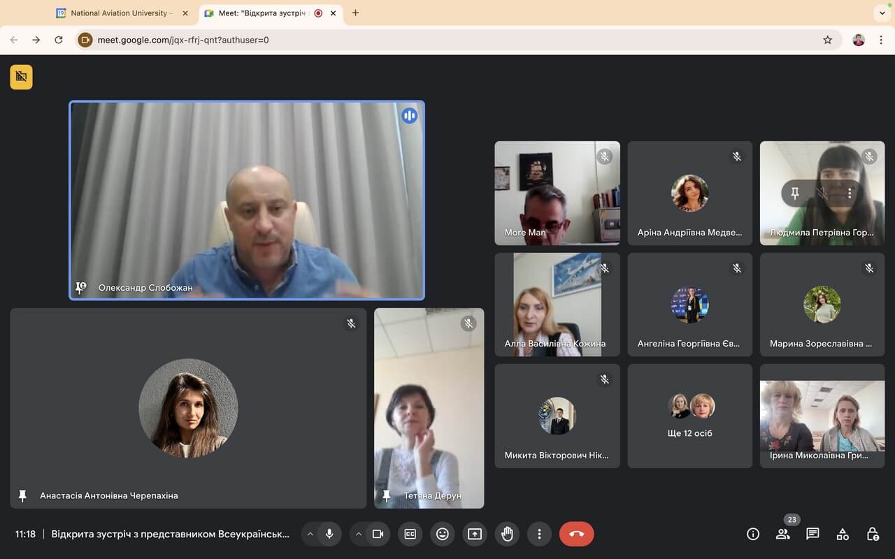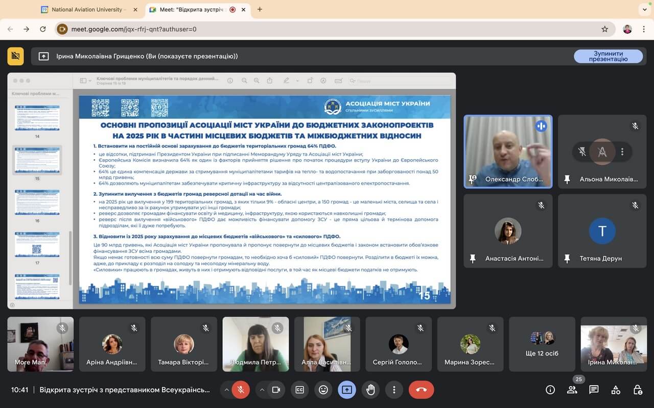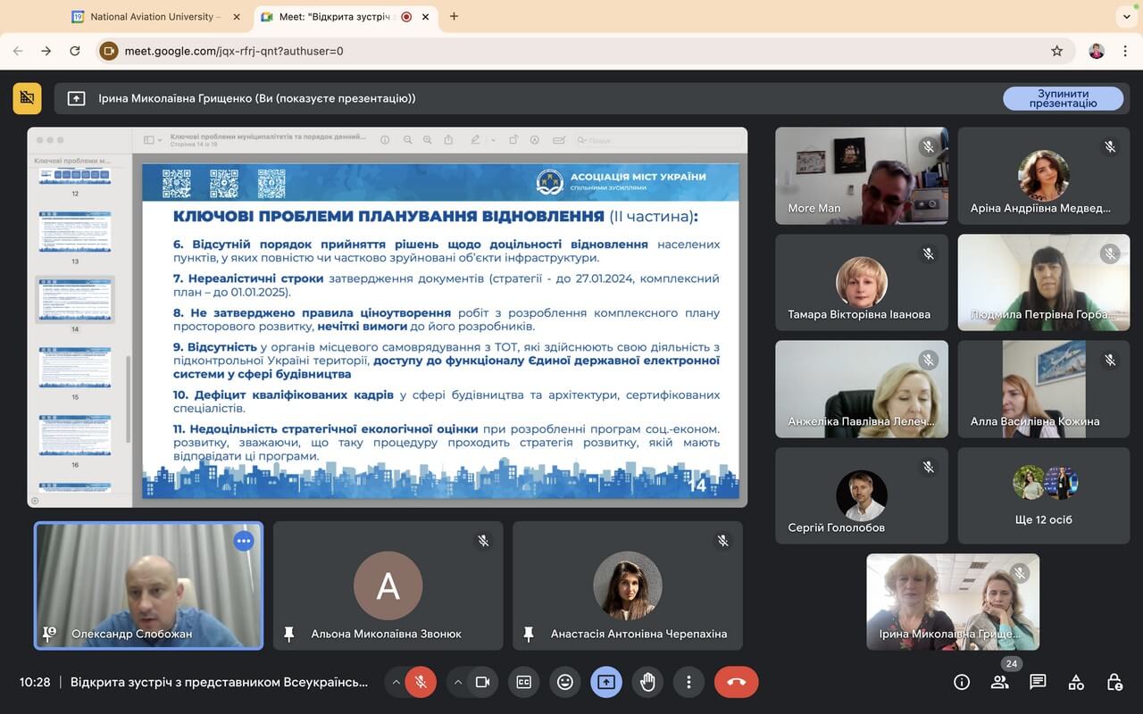 The Department of Public Management and Administration of the Educational and Scientific Institute of Continuing Education systematically introduces the concept of lifelong learning into the educational process. This time to a wide audience of higher education students with the specialty 281 “Public Management and Administration”, scientific and pedagogical staff of the department and all other participants of the meeting who expressed a desire to join the event online or offline to learn more about the processes taking place in Ukraine on levels of territorial communities during the legal regime of martial law, the Executive Director of the All-Ukrainian Association of Local Governments “Association of Cities of Ukraine” Oleksandr Slobozhan visited.
