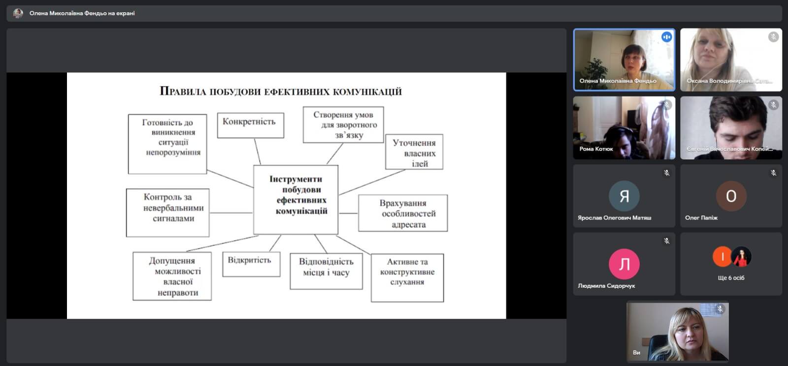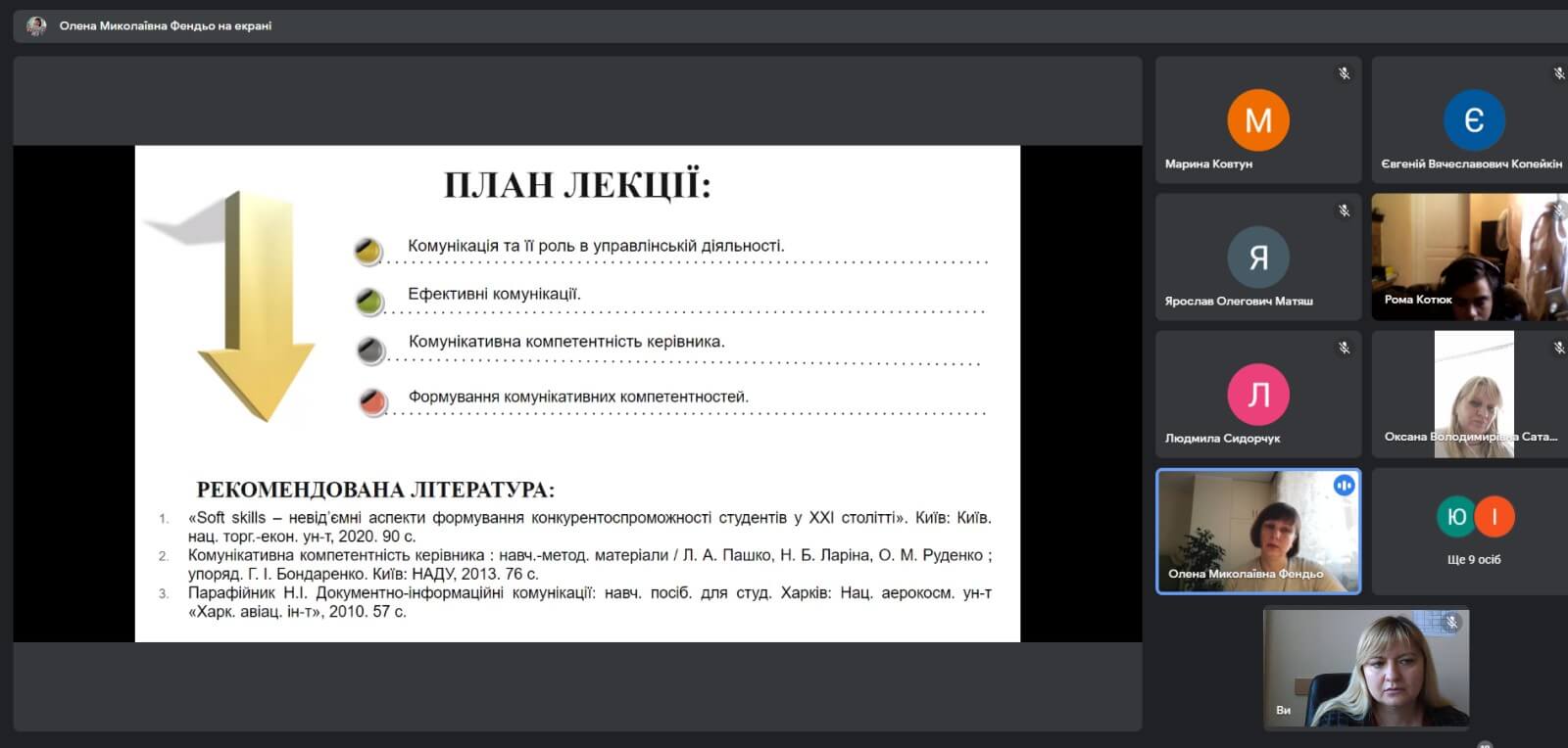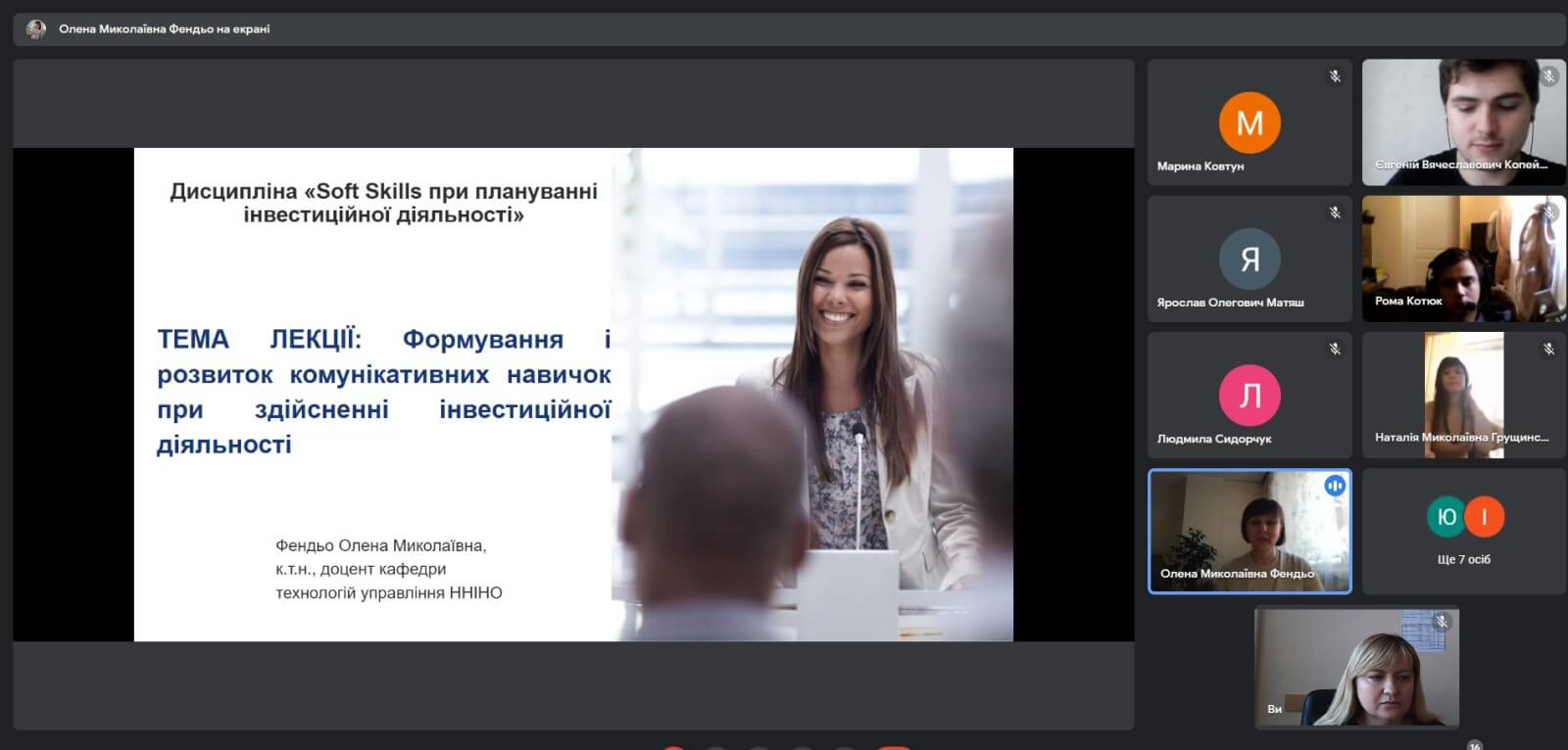 On February 14, 2022, according to the established schedule, an open lecture was held by Associate Professor of Management Technologies, Candidate of Technical Sciences Fendyo Olena Mykolayivna for full-time students of OS “Master” in the discipline “Soft-skills in investment planning”. The open lecture was attended by: Deputy Director of NNINO Grushchynska NM, Head of the Department of Management Technology Polishchuk OV, Associate Professor of Management Technology Dubinina VV Head of the Department of Human Factor Management Sidorchuk LA, Associate Professor of Human Factor Management Sivashenko TV