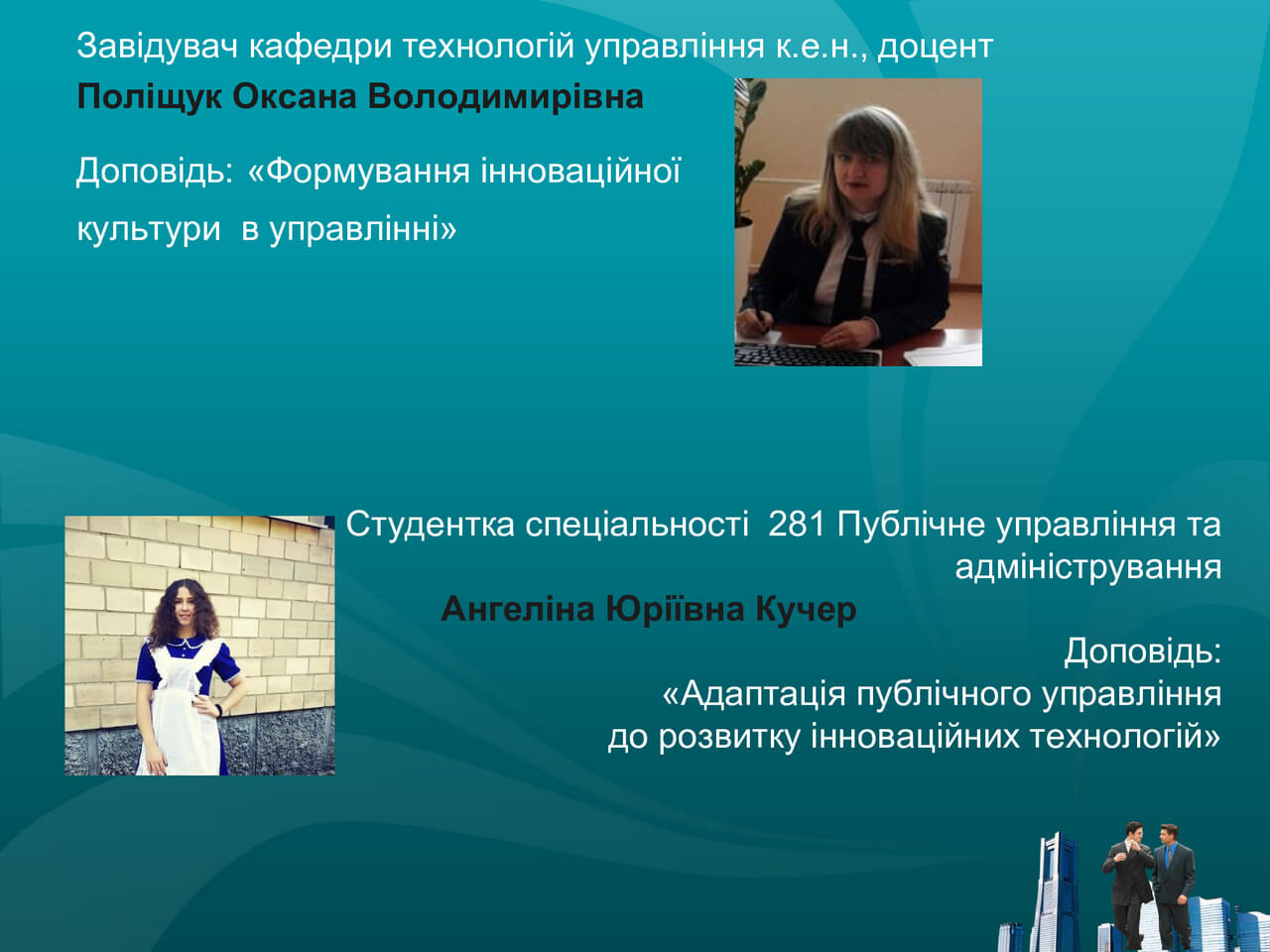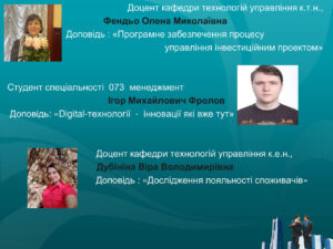 The event was opened by the Head of the Department of Management Technologies, Ph.D., Assoc. Oksana Volodymyrivna Polishchuk. Lecturers of the Department of Management Technologies Ph.D., Assoc. Fendyo Olena Mykolayivna, Candidate of Economic Sciences, Assoc. Dubinina Vera Vladimirovna. Students of the group PU-101 specialty 281 “Public Administration” and students of the group AM101-MD specialty 073 “Management”, EP “Administrative Management” took an active part in the meeting, in particular: Anastasia Cherepakhina with a report: “Foreign experience in personnel management”, Ala Kuzikova with a report: “Ways to improve the psychological climate in the enterprise”, Angelina Kucher with a report: “Adaptation of public administration to the development of innovative technologies”, Igor Frolov with a report: “Digital technologies – innovations that are already here ». The round table addressed current issues in promising areas of innovation processes in management.