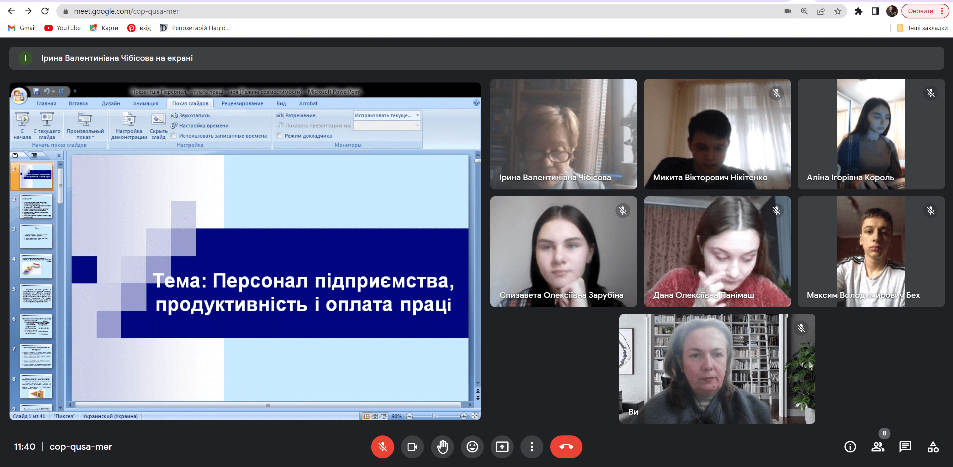 On March 9, 2023, an open online lecture was held on the basis of the Department of Public Management and Administration on the discipline “Economics of the enterprise”, which was conducted by Iryna Valentynivna Chibisova, associate professor of the Department of Public Management and Administration of the Educational and Scientific Institute of Continuing Education. Topic of the lecture: