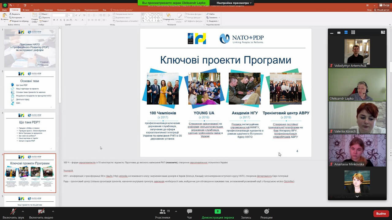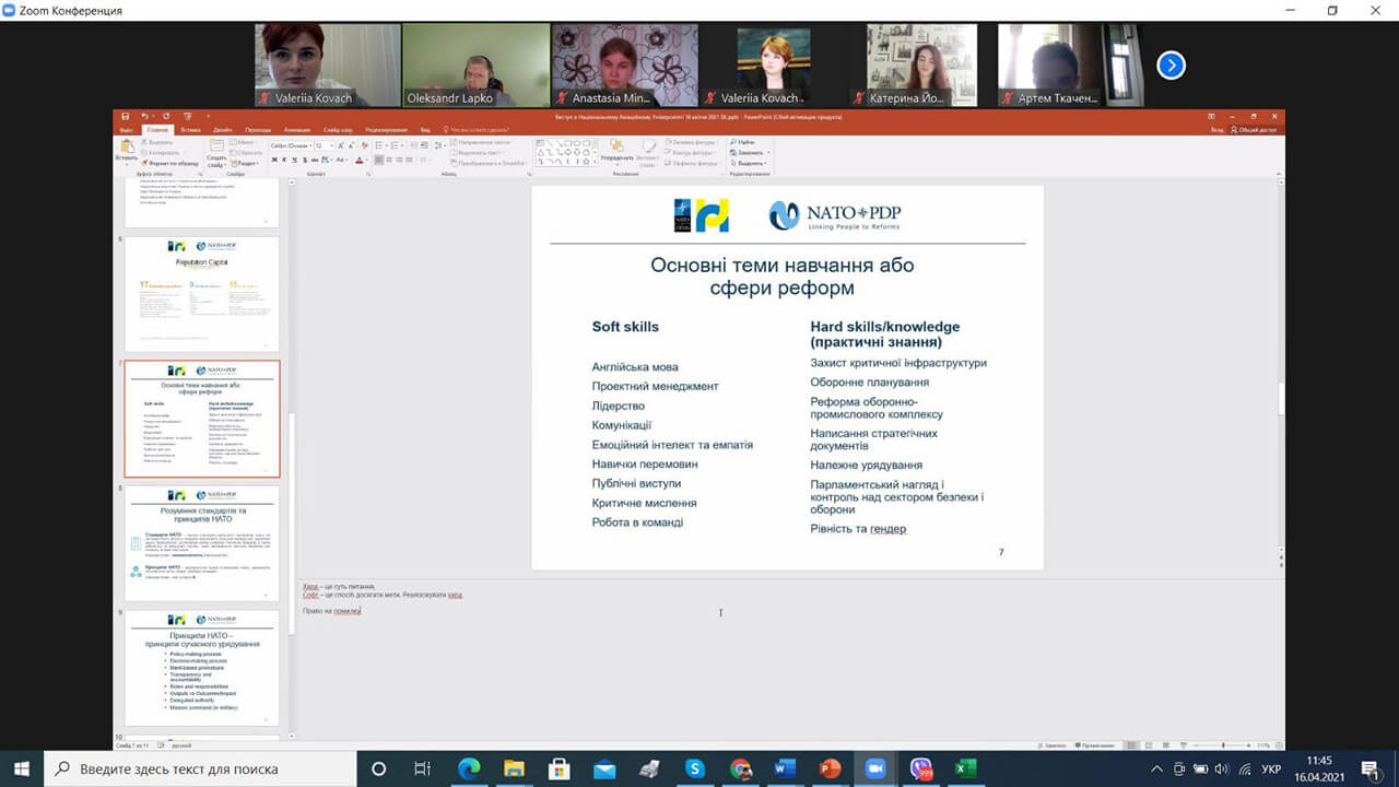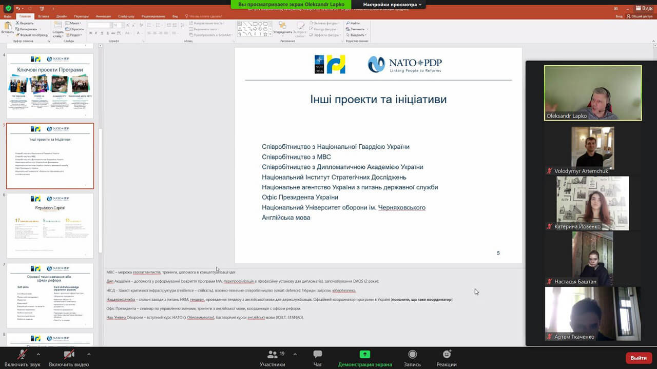 On April 16, 2021, the 1st year students of the Bachelor of Public Administration majoring in Public Administration NNINO and Associate Professor Valeria Kovach met with the Project Manager of the NATO Professional Development Program, NATO Representation in Ukraine Oleksandr Lapko! Mr. Oleksandr shared insights from his work, focusing on working with civil servants, answering students’ questions, and giving valuable guidance and advice to future government officials.
