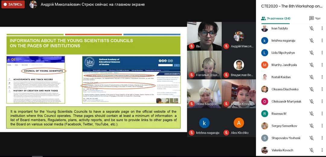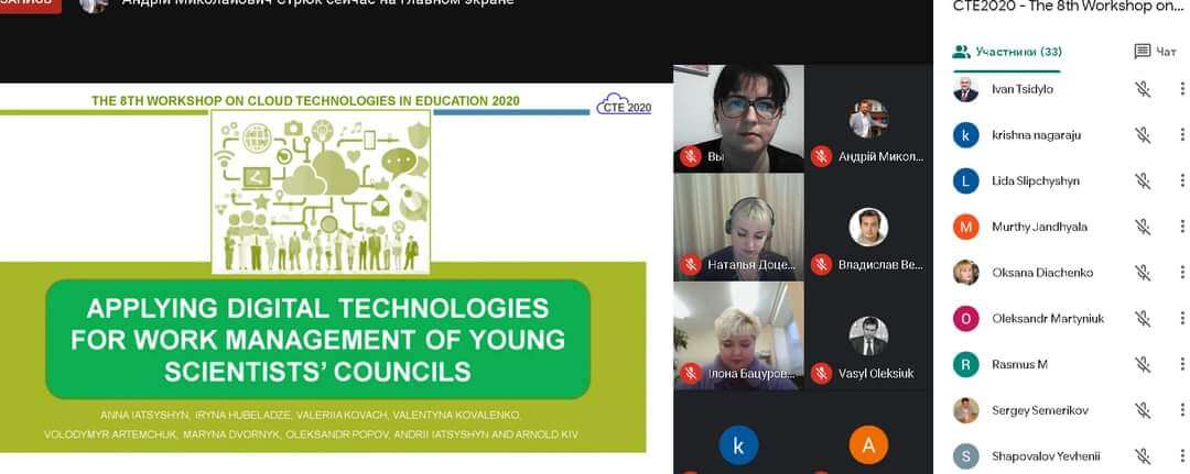 18 грудня 2020 р. під час семінару The 8th Workshop on Cloud Technologies in Education Попов Олександр, Ковач Валерія, Яцишин Анна, Артемчук Володимир, Коваленко Валентина та Яцишин Андрій представили результати колективного дослідження і поділилися досвідом застосування цифрових технологій для управління роботою Рад молодих вчених. Також, важливо відмітити співпрацю Рад молодих вчених різних установ, а саме: Рада молодих вчених НАН України, Рада молодих учених при МОН України та Ради молодих вчених НАПН України. Сподіваємось на продовження співпраці щодо популяризації наукових досліджень залучення молоді до наукової галузі. Дякуємо організаторам семінару за можливість представити наші результати та поділитися досвідом!